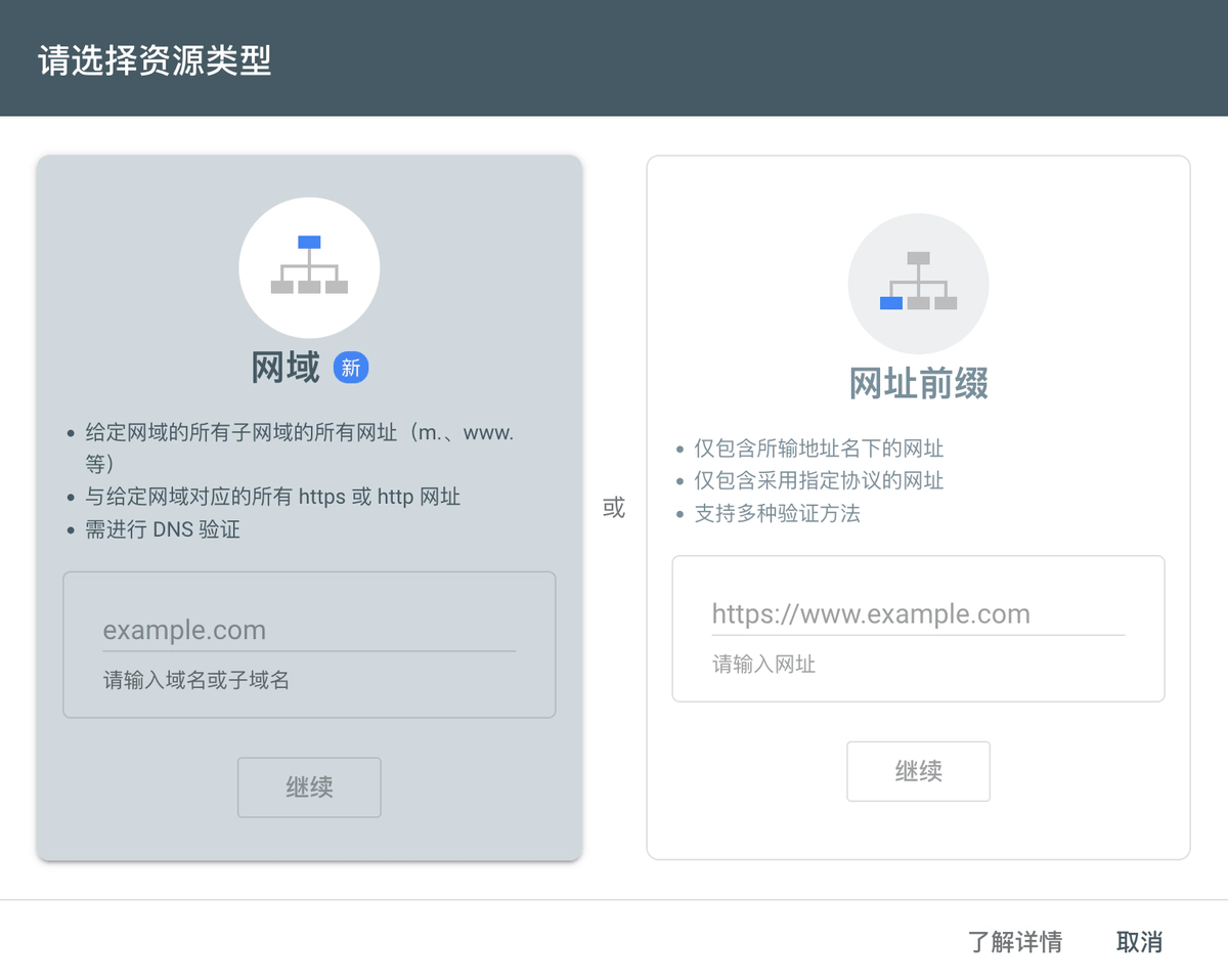 在添加资源时有两个选项,网域和网址前缀: